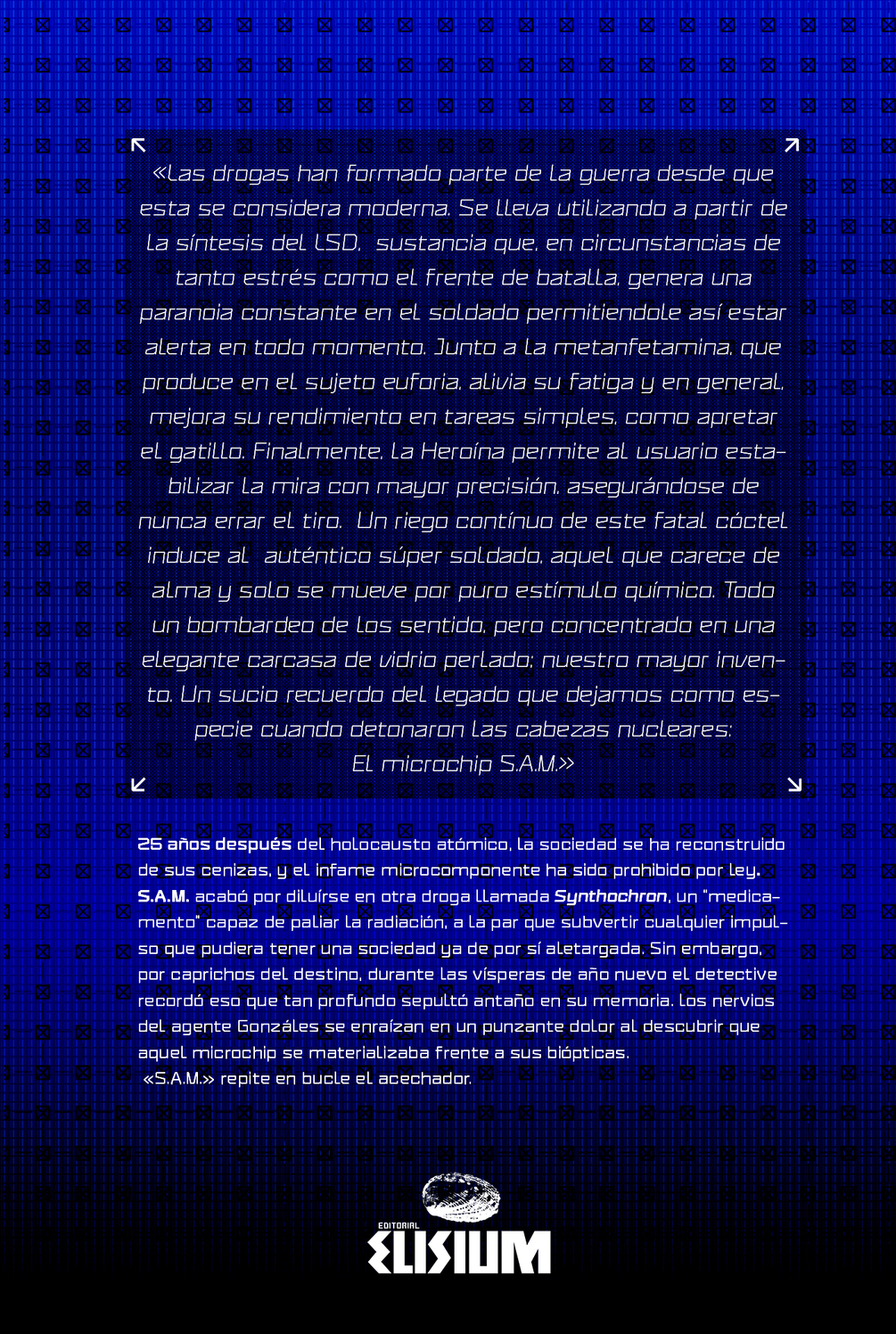 «Las drogas han formado parte de la guerra desde que esta se considera moderna. Se lleva utilizando a partir de la síntesis del LSD, sustancia que, en circunstancias de tanto estrés como el frente de batalla, genera una paranoia constante en el soldado permitiendole así estar alerta en todo momento. Junto a la metanfetamina, que produce en el sujeto euforia, alivia su fatiga y en general, mejora su rendimiento en tareas simples, como apretar el gatillo. Finalmente, la Heroína permite al usuario estabilizar la mira con mayor precisión, asegurándose de nunca errar el tiro. Un riego contínuo de este fatal cóctel induce al auténtico súper soldado, aquel que carece de alma y solo se mueve por puro estímulo químico. Todo un bombardeo de los sentido, pero concentrado en una elegante carcasa de vidrio perlado; nuestro mayor invento. Un sucio recuerdo del legado que dejamos como especie cuando detonaron las cabezas nucleares: